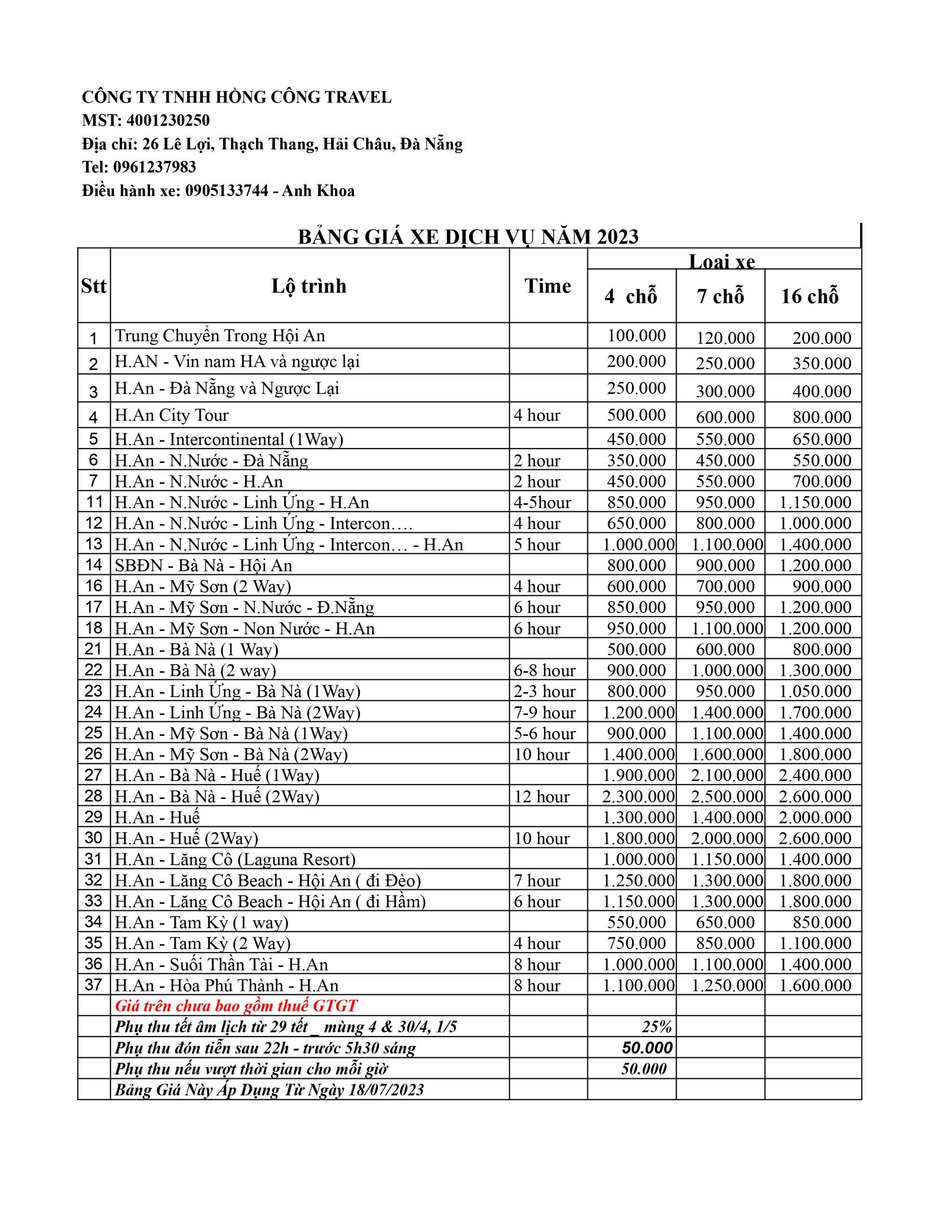 Bảng Giá Thuê Xe Du Lịch Đà Nẵng HongcongTravel