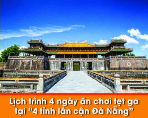 Sáng: Điểm tâm.Khởi hành tham quan Đại Nội – Hoàng cung triều Nguyễn, tham quan Ngọ Môn, Điện Thái Hòa, Tử Cấm Thành, Thế Miếu, Hiển Lâm Các, Cửu Đỉnh,…tiếp tục viếng Chùa Thiên Mụ cổ kính là nơi lưu giữ nhiều cổ vật quý có giá trị về mặt lịch sử và nghệ thuật.